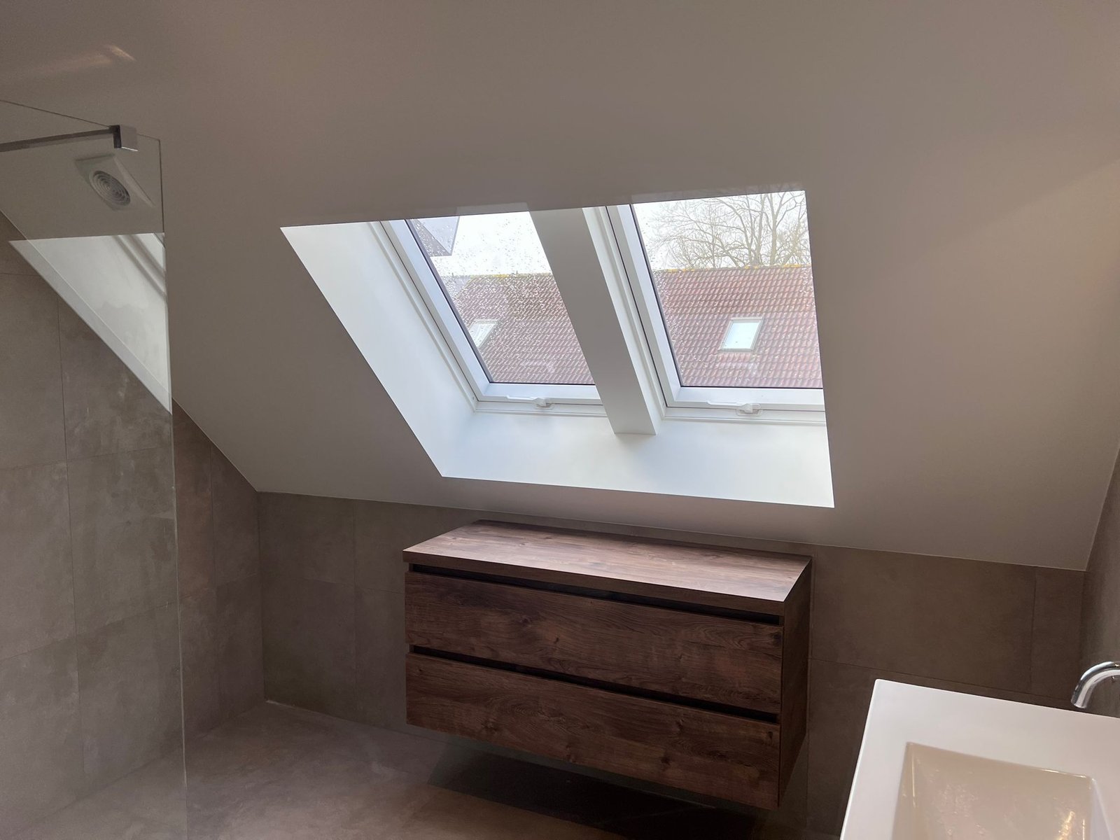 Moderne badkamer door ons geïnstalleerd. Van het leidingwerk en de afvoer tot de douche-installatie en afwerking.