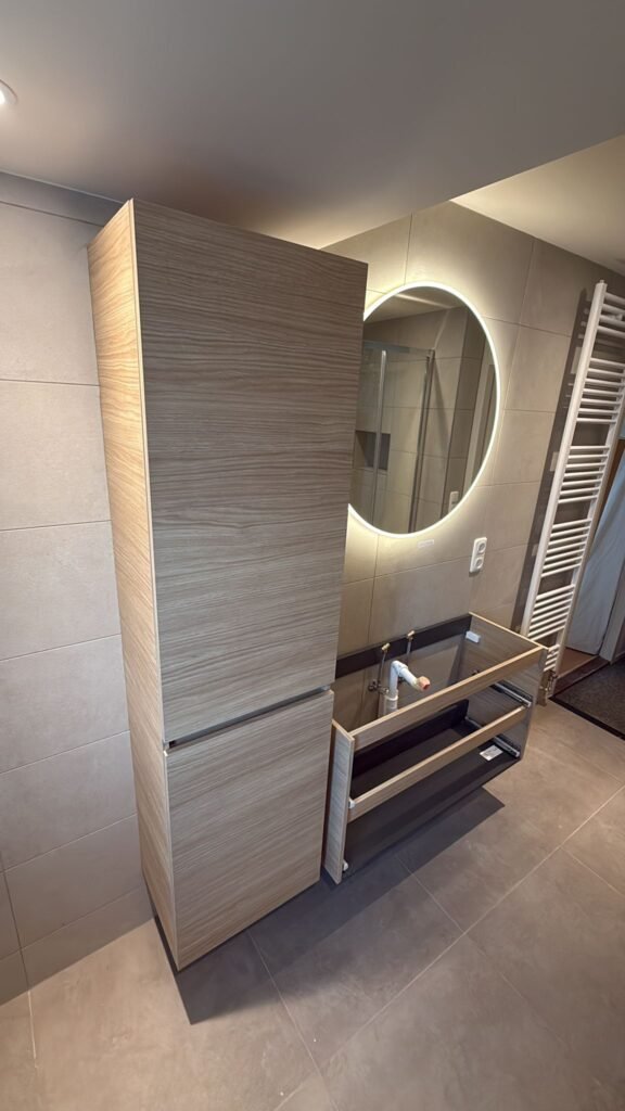 Bij deze badkamer hebben wij het meubel en de sanitaire aansluitingen gemonteerd en aangesloten.