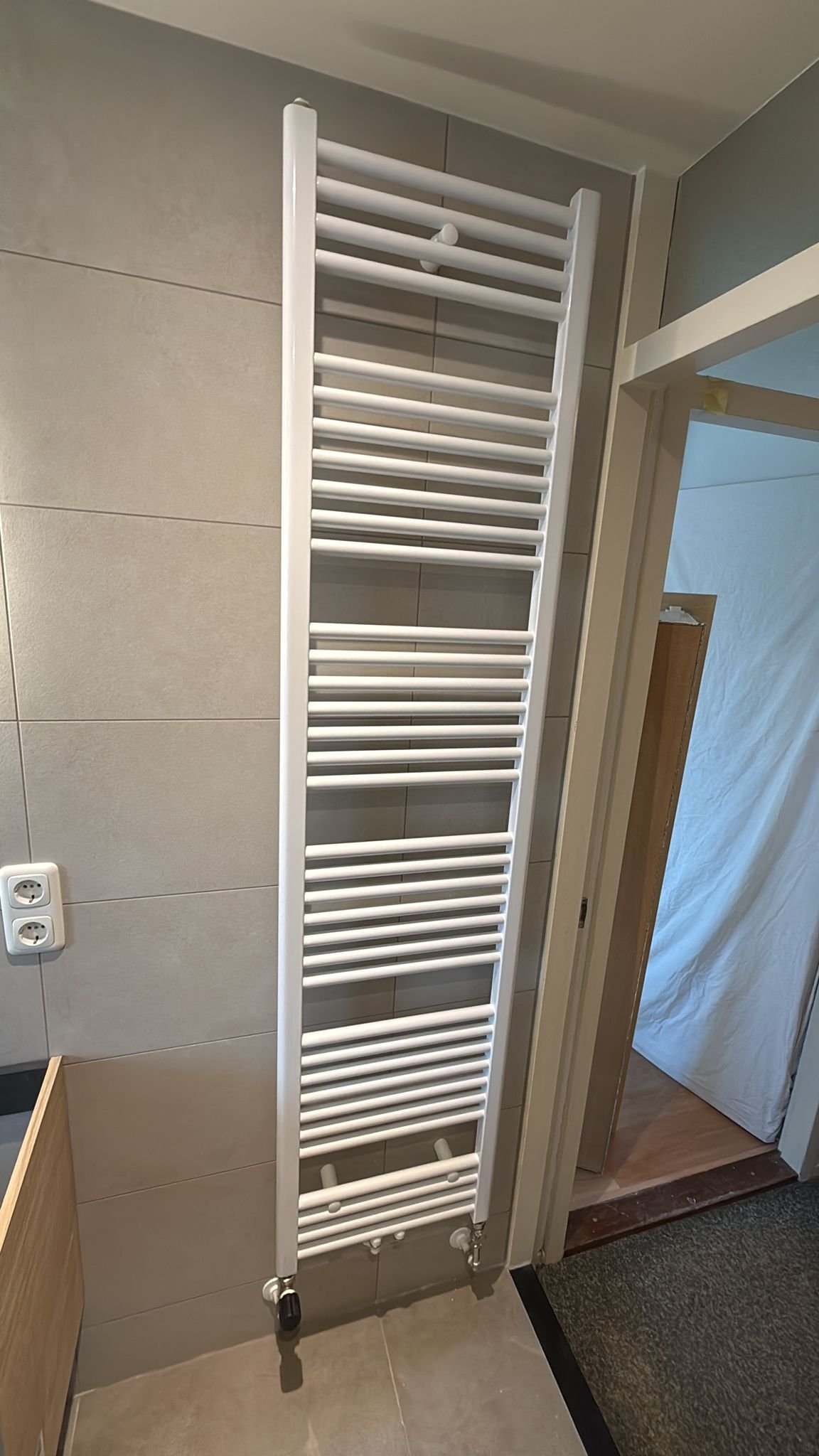 Bij deze badkamer hebben wij een moderne handdoekradiator geïnstalleerd en aangesloten op het verwarmingssysteem.
